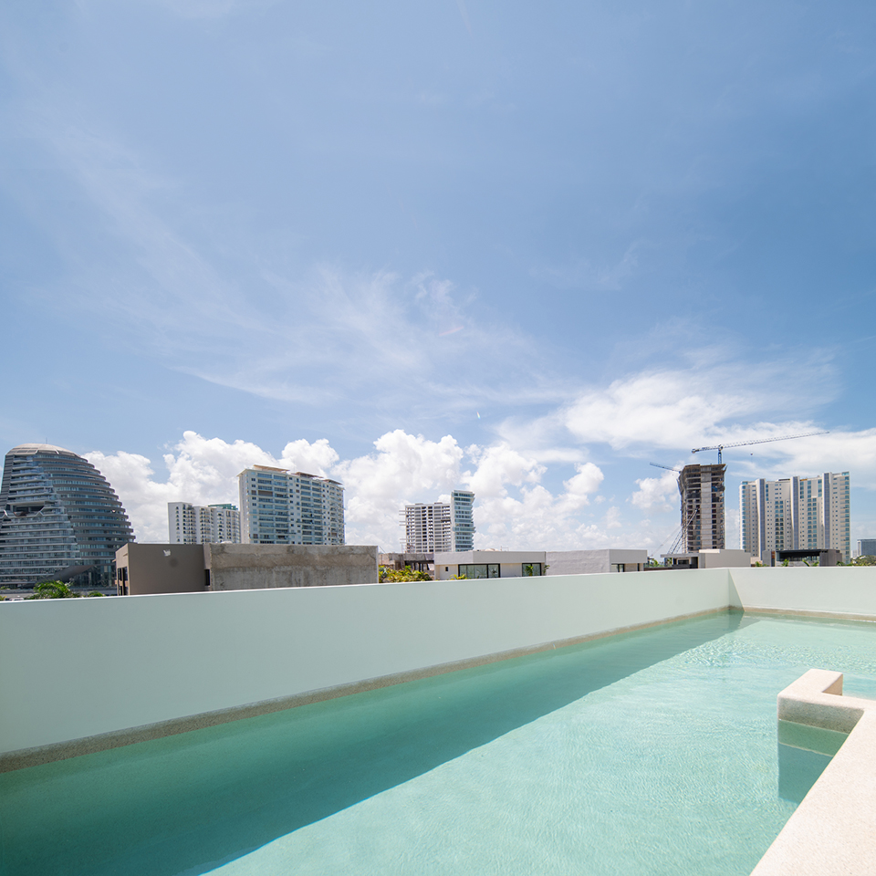 Segundo Nivel: recámara 2 con walk in clóset, roof garden con alberca, baño auxiliar.